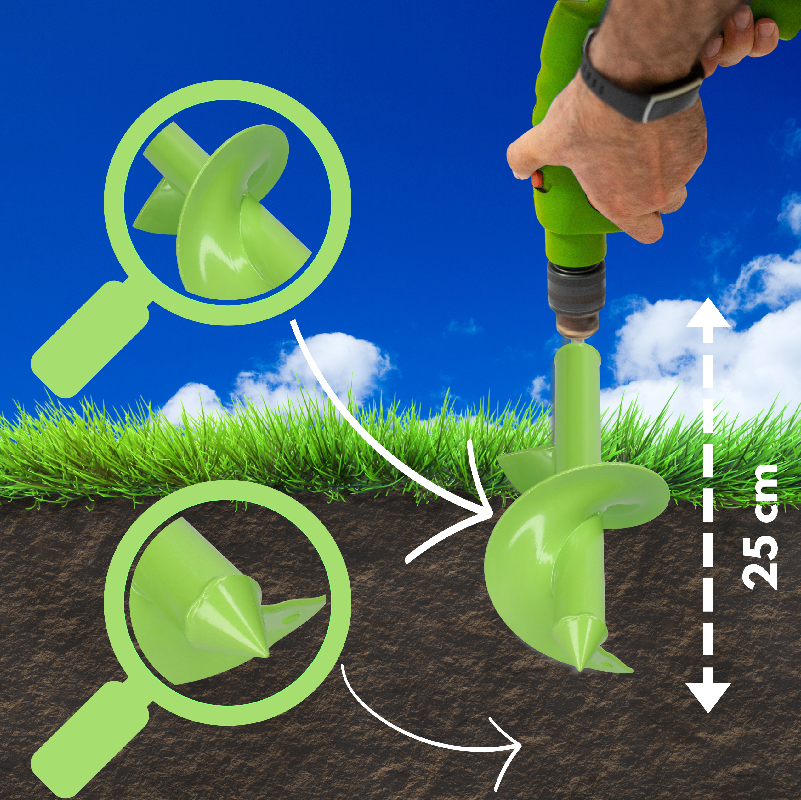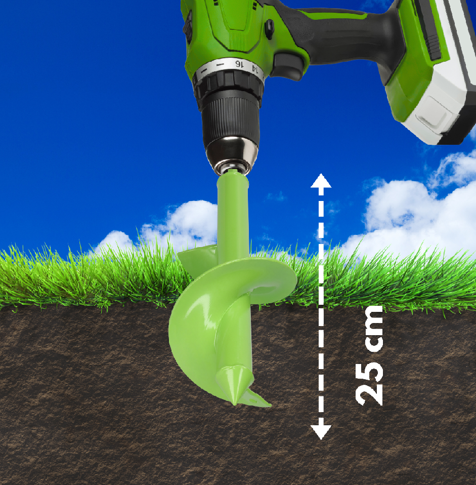 - trzymaj wkrętarkę stabilnie – narzędzie może szarpnąć przy kontakcie z kamieniem lub korzeniem