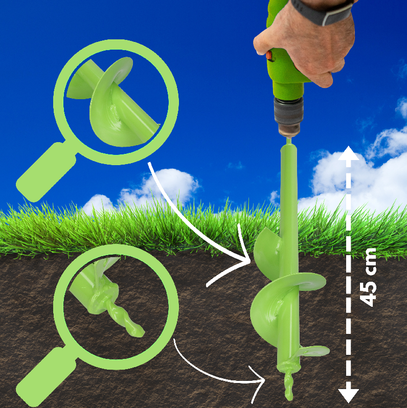 - trzymaj wkrętarkę stabilnie – narzędzie może szarpnąć przy kontakcie z kamieniem lub korzeniem